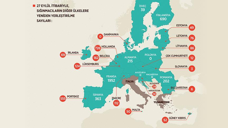 AA muhabirinin, AB Komisyonu verilerinden derlediği bilgilere göre, İtalya ve Yunanistan’dan toplam 160 bin sığınmacının Eylül 2017'ye kadar diğer AB ülkelerine yerleştirilmesi kararı alınmış olmasına rağmen, 27 Eylül itibarıyla bin 196’sı İtalya’dan, 4 bin 455’i de Yunanistan’dan olmak üzere sadece 5 bin 651 sığınmacı çeşitli ülkelere yerleştirilebildi.