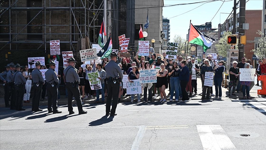 Ellerinde Filistin bayrakları taşıyan ve Biden'ı İsrail'e verdiği destek nedeniyle protesto eden göstericiler, "Özgür, özgür, özgür Filistin" diye seslendi.