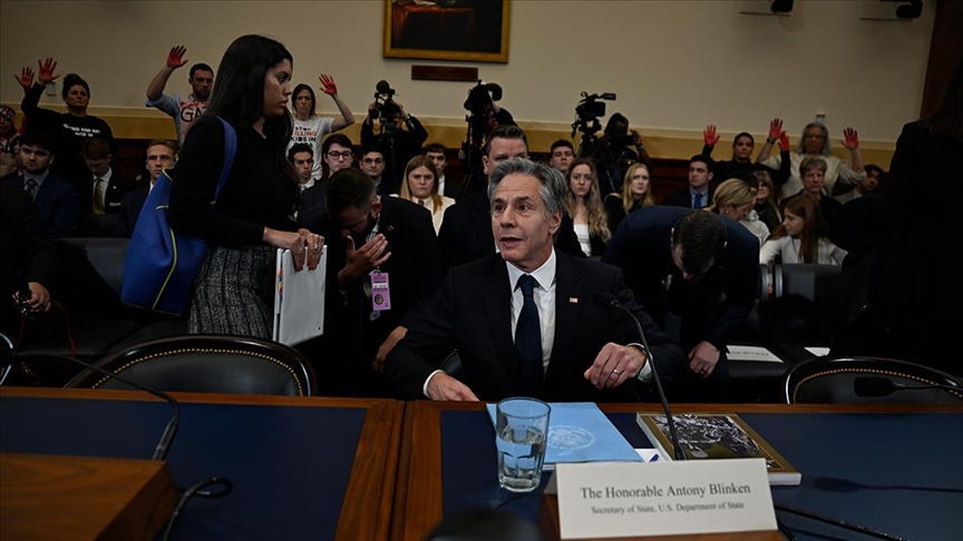 Blinken, konuşmasına başladıktan kısa süre sonra elinde Gazze ile ilgili mesajın yer aldığı pankartı tutan gösterici, "Soykırım bakanı" ve "Gazze kasabı" sloganları atarak Bakan'ı protesto etti.