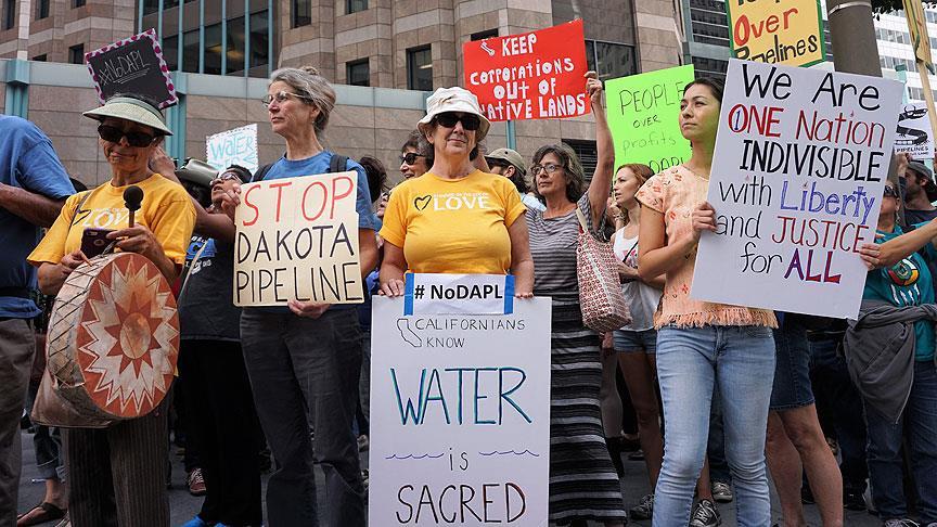 ABD'nin Kuzey Dakota eyaletinde inşa edilmesi planlanan "Dakota Access" boru hattı projesine karşı çıkan bine yakın yerli ve çevreci, Los Angeles Amerikan Ordusu Mühendislik Birimi (USACE) önünde toplanarak boru hattını protesto etti.