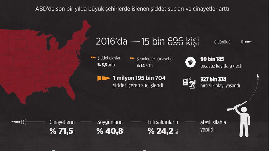 Chicago, Las Vegas, Los Angeles, Memphis, Nashville, Orlando ve San Antonio gibi önde gelen 13 kentte suç ve cinayet oranlarında son bir yılda artış yaşandı. Bir önceki yıla göre 2016'da cinayetler Los Angeles'ta 282'den 293'e, Dallas'ta 136'dan 173'e, Las Vegas'ta 127'den 176'ya, San Diego'da 37'den 67'ye, Memphis'te 135'ten 180'e ve Houston'da 303'ten 349'a çıktı.