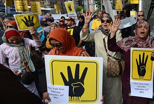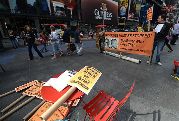 Times Meydanı'nda toplanan az sayıdaki grup, üzerinde ABD Başkanı Barack Obama ve eski Başkan George Bush'un fotoğraflarının yer aldığı pankartlar taşıdı. Yanlarında getirdikleri savaş karşıtı dövizleri taşıyacak gösterici bulamayan eylemciler, "Bir daha savaş istemiyoruz, Suriye'den uzak dur", "Savaşa hayır" ve "Suriye'yi bombalama" şeklinde sloganlar attı.