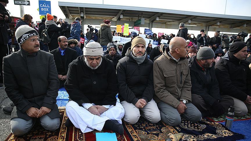 New York'taki Müslüman Amerikalılar, ABD Başkanı Donald Trump'ın göçmen karşıtı başkanlık kararnamelerine karşı dayanışma gösterisinde bulunmak amacıyla JFK Uluslararası Havalimanı'nda topluca cuma namazı kıldı.