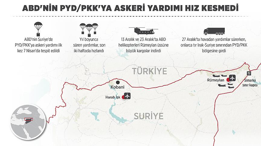 ABD, PYD/PKK'ya yıl içinde birçok kez askeri yardım ulaştırdı. Yardımlar, ABD'nin örgütün kontrolündeki Haseke'de kurduğu hava üslerine ve kuzey Irak'taki Erbil kentinden karayoluyla teslim edildi.