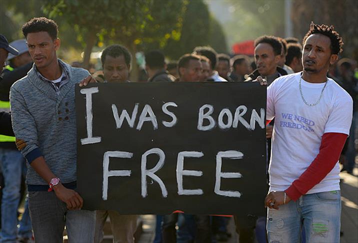 Aralarında Eritre, Kongo, Sudan ve Etyoplalıların bulunduğu kalabalık grup ''Ne istiyoruz?, Özgürlük!'' şeklinde slogan attı. Belediye binasının önündeki demir parmaklıklara yüklenen eylemcilerle İsrail polisi arasında kısa süreli bir gerginlik yaşandı.