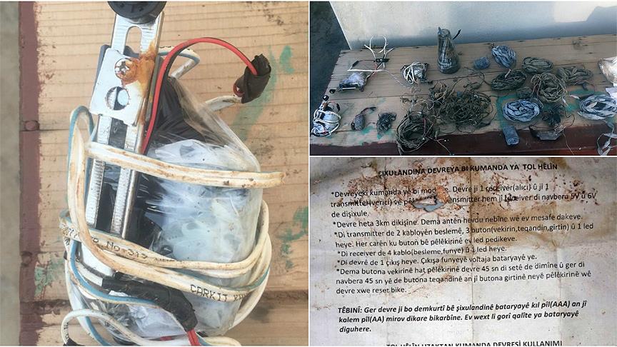 Genelkurmay Başkanlığından yapılan bilgilendirmeye göre, Afrin'in Halidiyeh bölgesinde, toprak altına gizlenmiş 12 tespih tipi patlayıcı düzenek, 3 çekme tipi patlayıcı düzenek, bir el yapımı patlayıcı, bir uzaktan kumanda devresi kullanıcı talimatı ile elektronik devrelerle ilgili ders kitabı ele geçirildi.