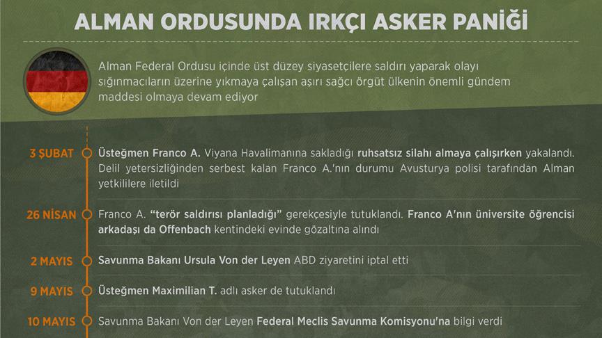 ''Terör saldırısı planladığı'' şüphesiyle 26 Nisan‘da tutuklanan aşırı sağcı üsteğmen Franco A.’nın ardından, geçen salı da üsteğmen Maximilian T.'nin gözaltına alındıktan sonra tutuklanması, Alman ordusunda aşırı sağ bir örgütlenme olduğu yönündeki tartışmaları alevlendirdi.