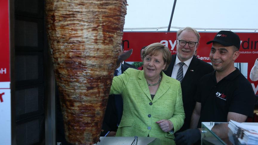 Çalışanlarla kısa süre sohbet de eden Merkel, kestiği dönerden tatmayı da ihmal etmedi.