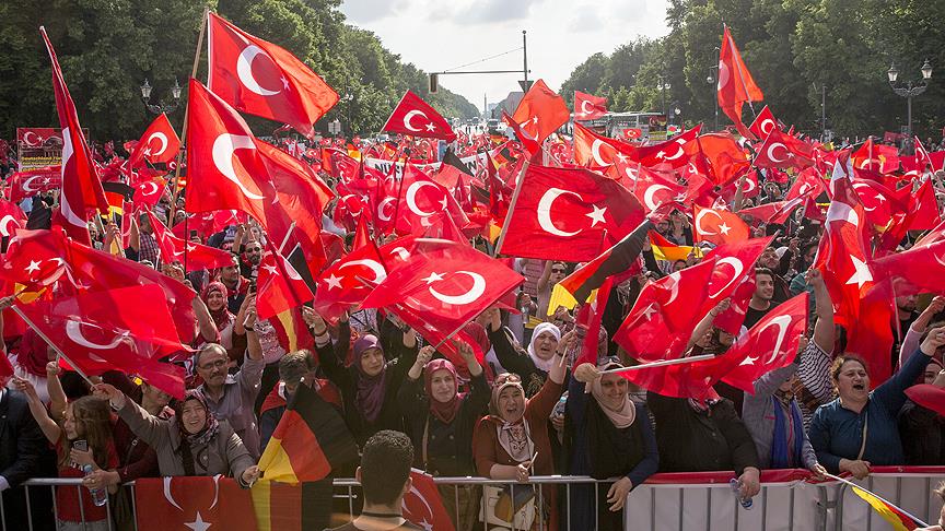 Türk-Alman Dayanışma Platformu tarafından Bundestag'a 100 metre mesafedeki tarihi Brandenburg Kapısı (Brandenburger Tor) önünde düzenlenen gösteriye yaklaşık 10 bin kişi katıldı.