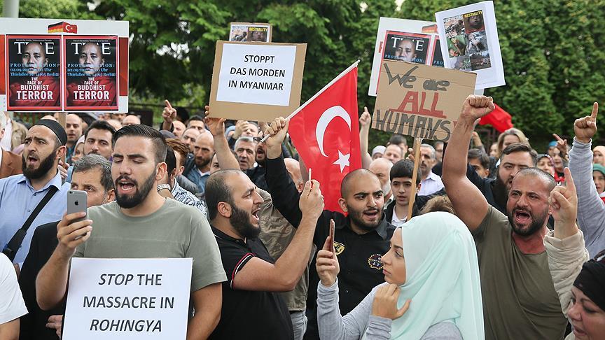 Berlin Türk Cemaati'nin düzenlediği ve Berlin'de faaliyet gösteren sivil toplum kuruluşlarının destek verdiği protesto gösterisinde Türk bayrakları ile üzerinde Almanca ve İngilizce "Myanmar'daki soykırımı durdurun", "Arakan'da Müslümanları öldürmeyi durdurun" ve "Katliamı durdurun" yazılı pankartlar taşındı.