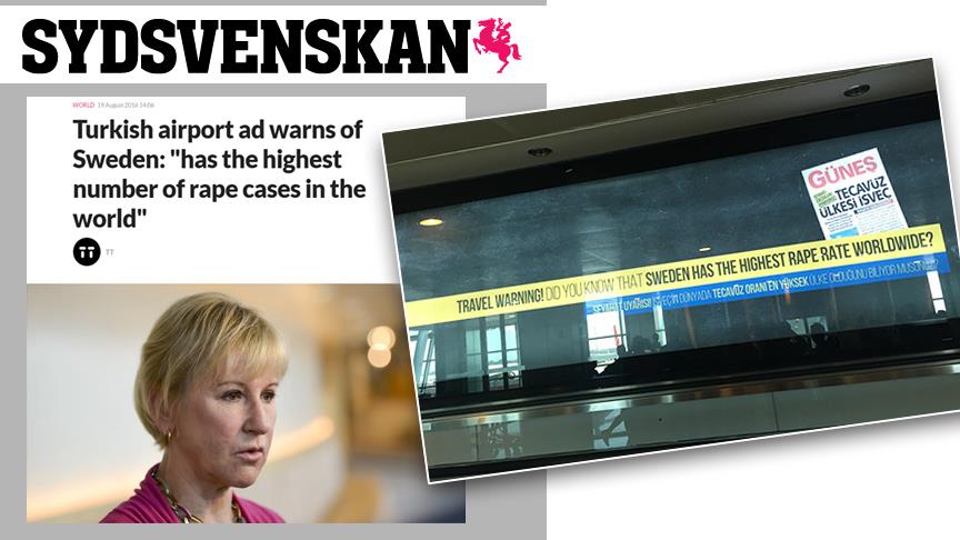 Sydsvenskan gazetesi de "Havalimanında İsveç uyarısı" başlığı ile verdiği haberde, ilanla ilgili ayrıntılara yer verdi. İlanların Güneş gazetesi tarafından verildiği belirtilen haberde, Daily Sabah gazetesinin de "Dünyada tecavüz oranı en yüksek ülke İsveç" başlıklı bir haber yayımladığı aktarıldı.