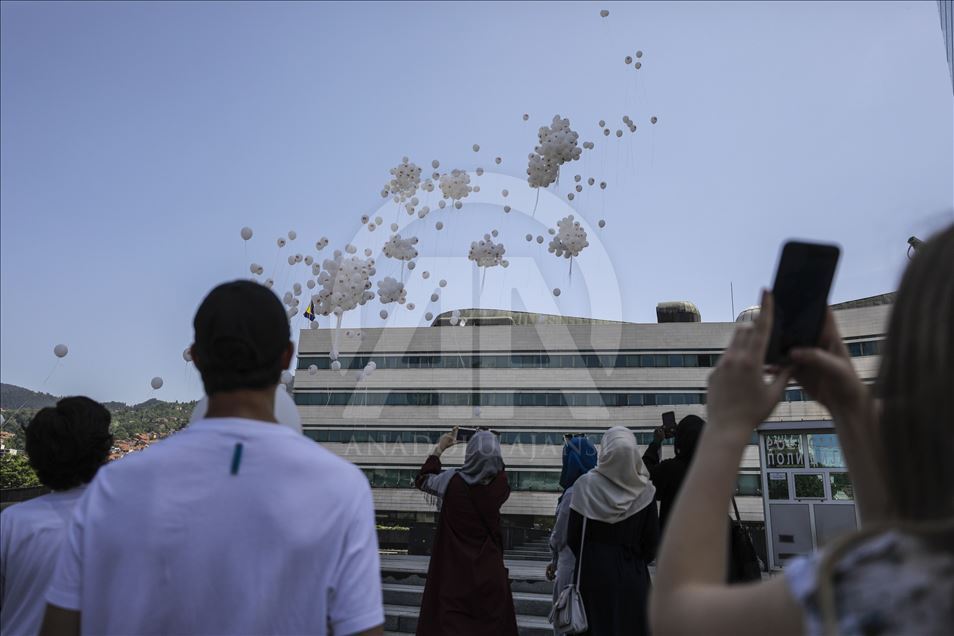 Saraybosna'daki gösteride, İdlib'de yaşanan insanlık dramına dikkati çekmek amacıyla üzerinde "We Are the Love" yazan bin adet beyaz balon gökyüzüne bırakıldı.