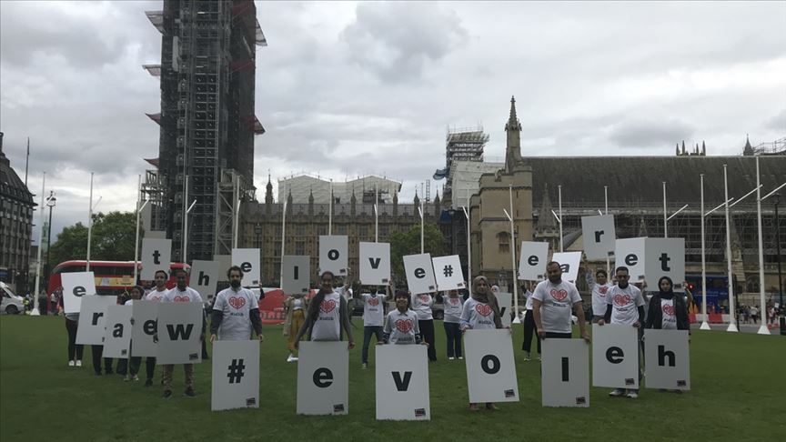 Başkent Londra'da da İngiliz parlamentosu önünde toplanan eylemciler, İngilizce "Biz sevgiyiz (we are the love)" cümlesini oluşturan harfleri taşıyarak kalp biçiminde sıralandı.