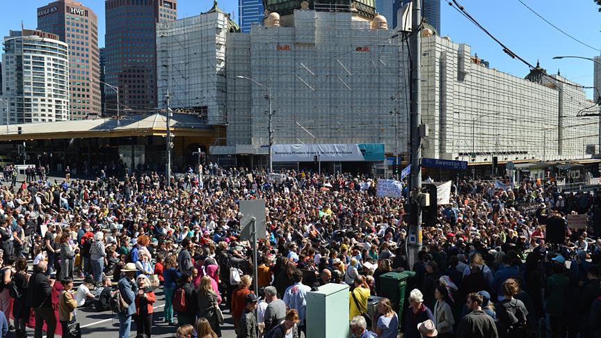 Melbourne kent merkezine kadar yürüyen göstericiler, Flinders Caddesi'ni trafiğe kapatarak yaklaşık iki saat oturma eylemi yaptı.