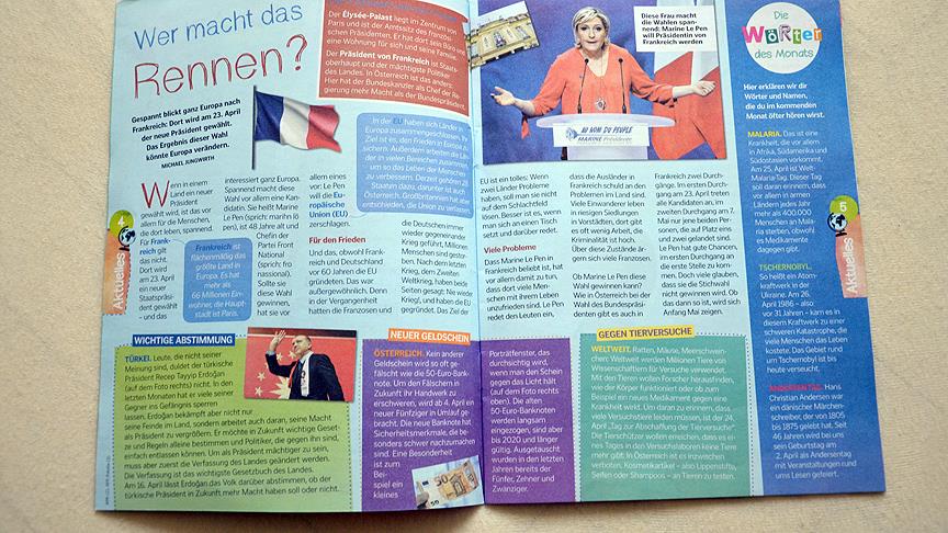 Avusturya'nın Vorarlberg eyaletinde, özel bir yayın kuruluşu tarafından pilot proje kapsamında ilkokul 3. ve 4. sınıf öğrencilerine dağıtılan 'Pausen Zeitung' adlı dergide, 2017 yılında Avrupa genelinde yapılacak seçimlere yer verildi. Çocuklara okuma alışkanlığını kazandırmayı amaçlayan projede, Cumhurbaşkanı Recep Tayyip Erdoğan ve Türkiye'de 16 Nisan'da halk oylamasına sunulacak cumhurbaşkanlığı hükümet sistemine ilişkin yanlış ve taraflı bilgiler de yer aldı.
