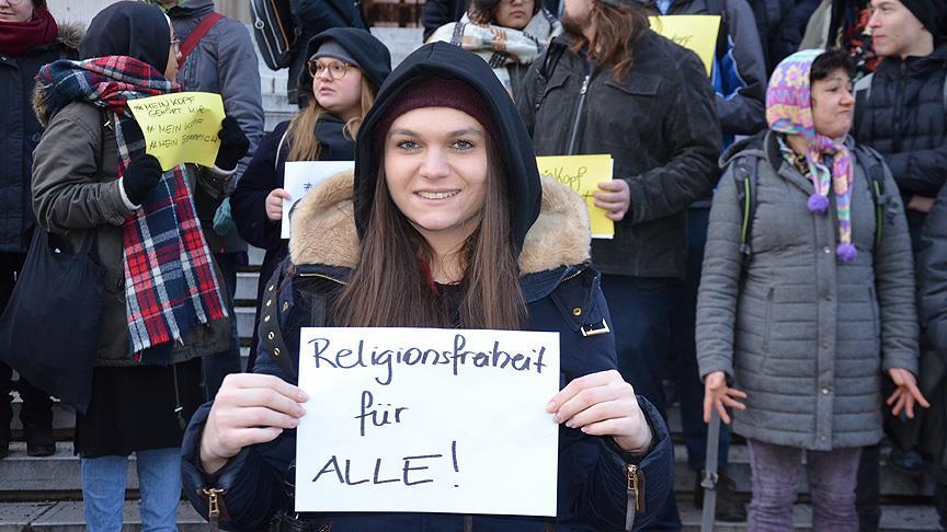 "Herkese din özgürlüğü", " Kafam bana ait", " Eşitlik", yazılı pankartlar taşıyan protestocular, uyum yasası kapsamında getirilmek istenen yasağa tepki gösterdi.