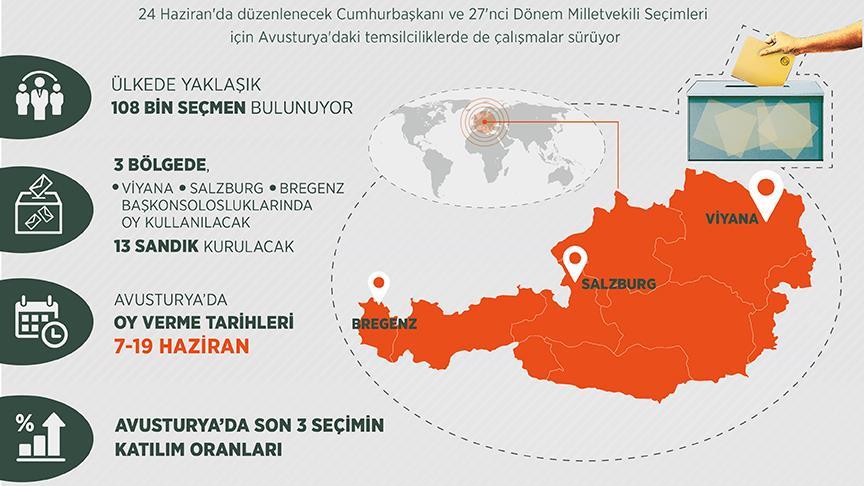 Seçmenler, daha önce 10 Ağustos 2014'te cumhurbaşkanlığı seçimi, 7 Haziran ve 1 Kasım 2015 genel seçimleri ile 16 Nisan 2017'de yapılan Anayasa değişikliği referandumunda oy vermişti. Avusturya’daki Türk seçmenler 24 Haziran'da Cumhurbaşkanı ve 27. Dönem Milletvekili Genel Seçimleri için oy kullanmak için beşinci kez sandığa gitmiş olacak.