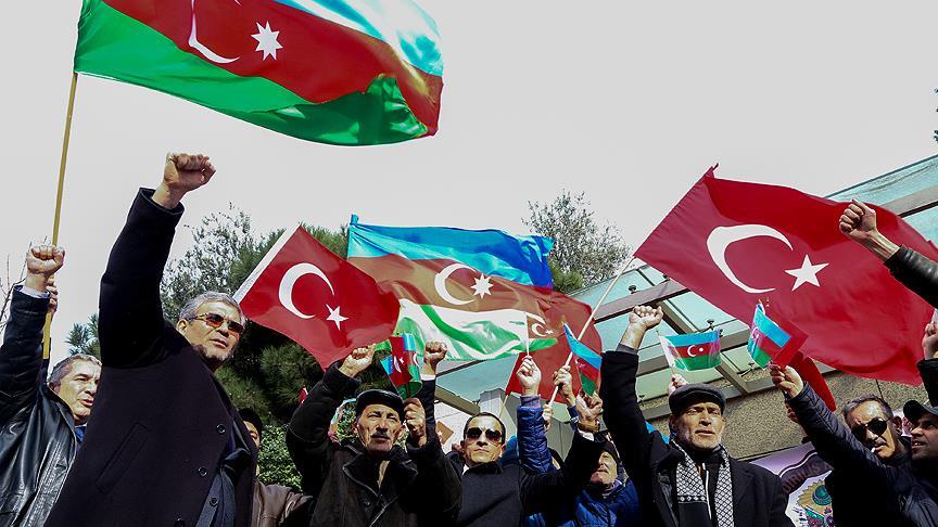 Azerbaycan ve Türkiye bayrakları taşıyan grup, "Bir millet, iki devlet, Azerbaycan-Türkiye", "Yaşasın Türkiye-Azerbaycan", "Recep Tayyip Erdoğan" sloganı attı.