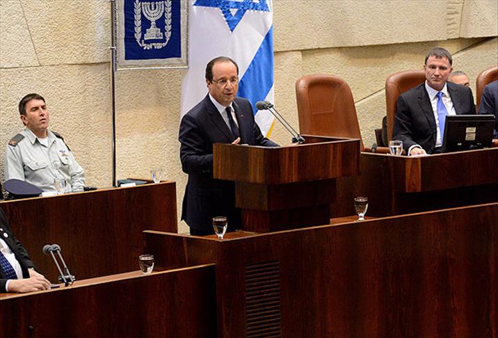 Resmi temaslarda bulunmak üzere geldiği İsrail'de, milletvekillerine hitaben konuşma yapan Hollande, "Filistin Devlet Başkanı Mahmud Abbas'la barış müzakerelerine ilişkin görüşmelerde bulundum. Başkentleri Kudüs olan İsrail ve Filistin devletleri kurulmalı" değerlendirmesinde bulundu.