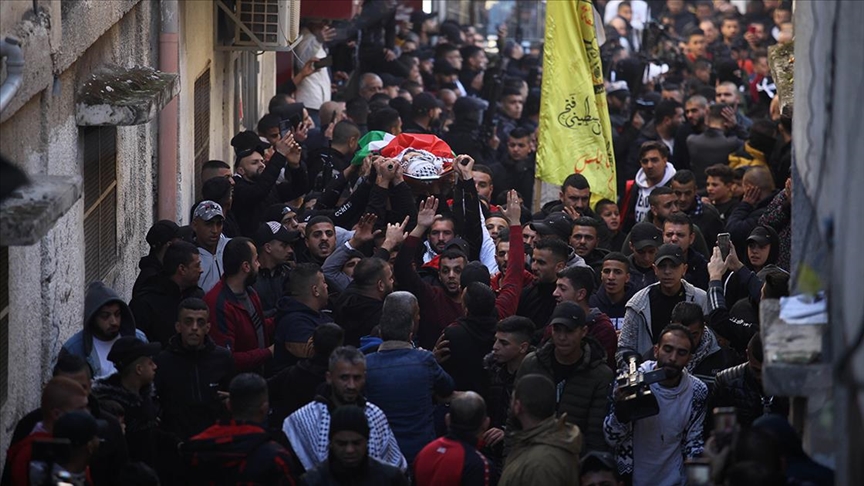 Binlerce kişinin katıldığı cenaze töreninde İsrail karşıtı sloganlar atıldı, Filistinli direniş örgütlerine bağlı maskeli kişilerce havaya ateş açıldı.
