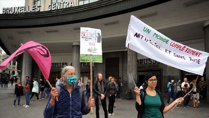 Belçika’nın başkenti Brüksel’de mekez tren istasyonu önünde toplanan bir grup gösterici, 5. nesil iletişim teknolojisi olan 5G altyapısı yatırımları ile ilgili protesto gösterisi düzenlendi. ( Dursun Aydemir - Anadolu Ajansı )