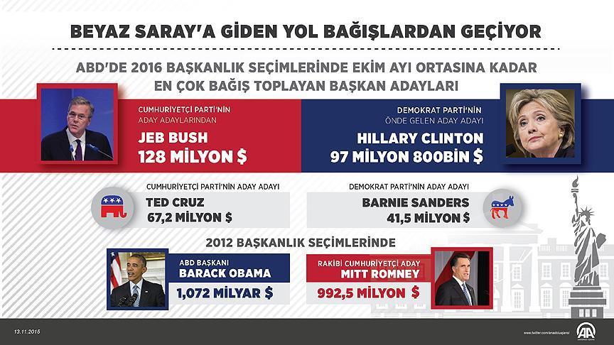 ABD Federal Seçim Komisyonu'nun (FEC) verilerine göre, Ekim ayı ortasına kadar en çok bağışı, yaklaşık 128 milyon dolarla Cumhuriyetçi aday adayı Jeb Bush topladı. Bush'u, Demokrat partinin önde gelen aday adayı Hillary Clinton 97 milyon 800 bin dolar destekle izlerken, en fazla maddi yardım alan üçüncü ve dördüncü aday adaylarını 67 milyon 200 bin dolarla Cumhuriyetçi Ted Cruz ve 41 milyon 500 bin dolarla Demokrat Barnie Sanders oluşturdu. Cumhuriyetçi adaylardan Ben Carson ise 38 milyon 254 bin dolarla beşinci sırada yer aldı. Anketlerde öne çıkan Cumhuriyetçi Donald Trump ise kampanyasını kendi imkanlarıyla finans edebileceği için çıkar gruplarından bağış kabul etmiyor.