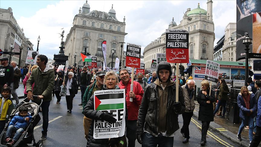 Filistin Dayanışma Kampanyası ile Savaşı Durdur Koalisyonunun başını çektiği çok sayıda sivil toplum örgütünün Londra’da gerçekleştirdiği yürüyüşe binlerce gösterici katıldı.