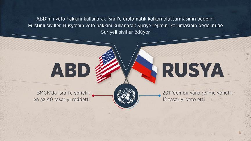 Birleşmiş Milletler'in (BM) 5 daimi üyesinden ABD ve Rusya'nın vetoları, Filistin ve Suriye'de yaşanan insanlık dramı ve sivil kayıpların önüne geçilmesine engel oluyor.