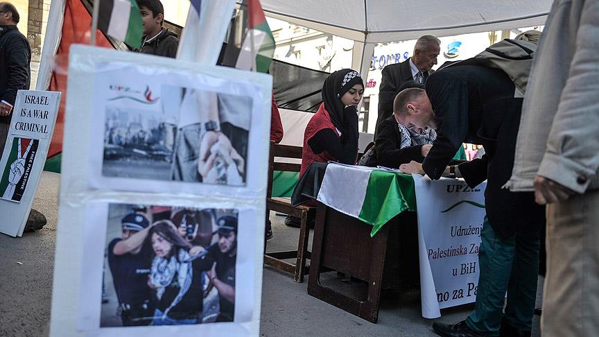 Bosna Hersek'in başkenti Saraybosna'da Filistinlilere destek amacıyla gösteri düzenlendi ve imza kampanyası başlatıldı.