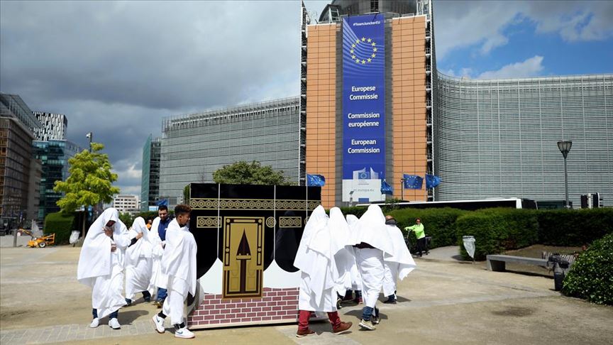 Çeşitli Müslüman ülkelerden 20 civarında gösterici, AB kurumlarının bulunduğu Schuman Meydanı'nda kurdukları Kabe maketi etrafında temsili tavaf gerçekleştirdi.