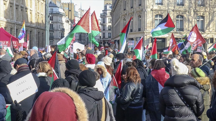 Paris'te bulunan Cumhuriyet Meydanı'nda ellerinde Filistin bayraklarıyla toplanan göstericiler, Gazze'de derhal ateşkes sağlanması çağrısında bulundu.