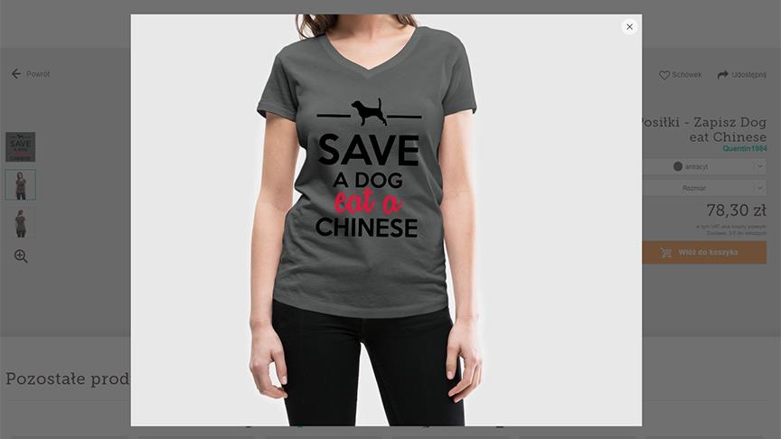 Şinhua haber ajansı, Çin'in Berlin Büyükelçiliğinin, üzerinde İngilizce "Bir köpeği kurtarın, bin Çinli yiyin" ve "Bir köpek balığını kurtarın, bir Çinli yiyin" yazılı tişörtlerin internetten satışının durdurulması için Alman makamlarını göreve davet ettiğini belirtti.