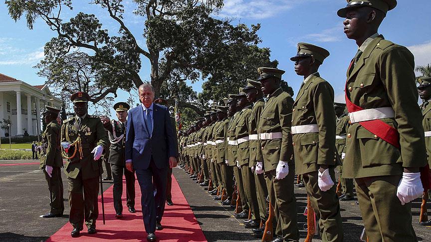 Entebbe'de bulunan Cumhurbaşkanlığı Sarayı'nda gerçekleşen törende iki ülkenin milli marşları çalındı. Erdoğan'ın tören kıtasını selamlamasının ardından 21 pare top atışı yapıldı. Karşılamanın ardından iki cumhurbaşkanı birbirlerine heyetlerini takdim etti.