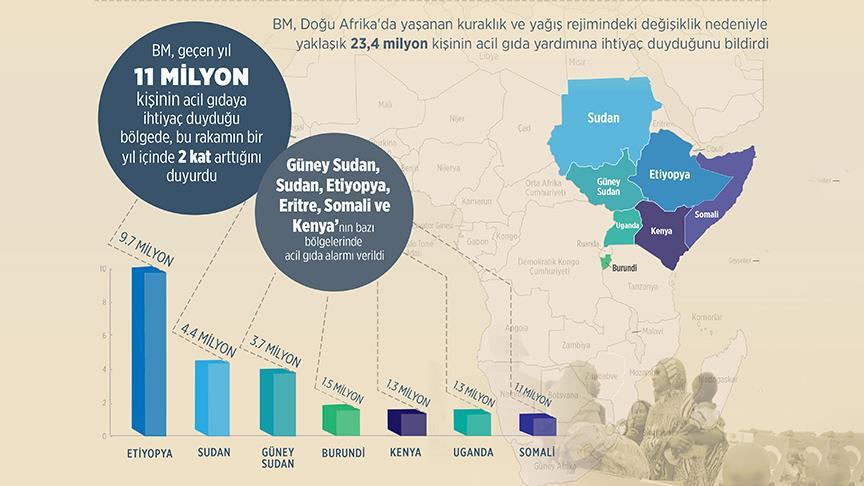 BM İnsani İşler Koordinasyon Ofisi (OCHA) tarafından hazırlanan raporda, Doğu Afrika bölgesinde görülen doğa olayı El Nino'nun yol açtığı kuraklığın etkilerinin sürdüğü ve bölgede yağış rejiminde değişiklik, ekonomik kriz ve göç trafiği gibi sebeplerle acil gıda ihtiyacı doğduğu belirtildi.