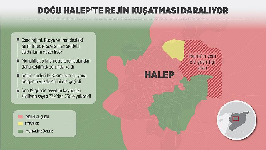 Rejim ordusu, Rusya ve İran destekli Şii milisler, son 19 gündür Halep'in doğusunda muhalif güçlerin kontrolündeki semtlere havadan ve karadan şiddetli saldırılar düzenliyor.
