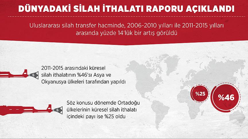 Raporda, Asya ve Okyanusya ülkelerinin silah ithalatını 2006-2010 dönemine göre yüzde 26 artırdığına dikkat çekilirken, 2011-2015 yılları arasındaki küresel ithalatın yüzde 46'sının bu ülkelere yapıldığı kaydedildi.