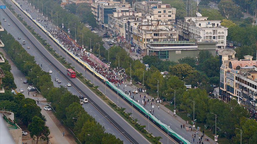 Başkentte Cumhurbaşkanlığı, Başbakanlık ve bakanlıkların bulunduğu Kırmızı Bölge'den itibaren açılan 5 kilometrelik Keşmir bayrağını binlerce Pakistanlı kaldırdı.