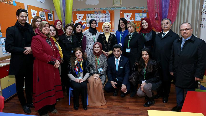 Emine Erdoğan'a ziyaretinde Milli Eğitim Bakanı İsmet Yılmaz ve Maarif Vakfı Başkanı Birol Akgün'ün yanı sıra Genelkurmay Başkanı Orgeneral Hulusi Akar'ın eşi Şule Akar'la bazı bakan eşleri de eşlik etti.