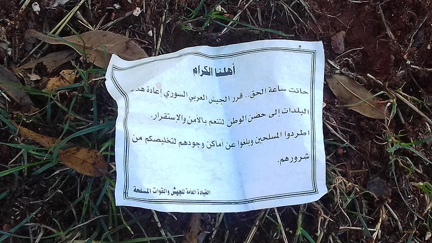 Broşürlerde, bölge halkından silahlarıyla birlikte rejim güçlerine teslim olmaları istendi.