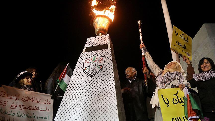 Gazze'deki Meçhul Asker Anıtı'nın olduğu meydanda, eski Filistin Devlet Başkanı Yaser Arafat ile halefi Mahmud Abbas'ın yer aldığı ve "Kudüs ebedi başkentimizdir" yazılı dev posterler asan Fetih Hareketi mensupları, hareketin kuruluşunun 53'üncü yıl dönümünü meşale yakarak kutladı.