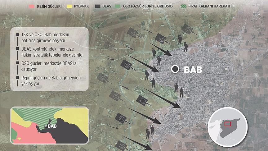 Türk Silahlı Kuvvetlerinden, Suriye'nin kuzeyindeki terör hedeflerine yönelik devam eden Fırat Kalkanı Harekatı'nın 169'uncu gününde, El Bab'ın kontrolü için dün gece başlanan operasyonlar sonucu strateji̇k öneme sahip tepelerin TSK'nın desteğindeki Özgür Suriye Ordusu unsurlarınca ele geçirildiği bildirildi.
