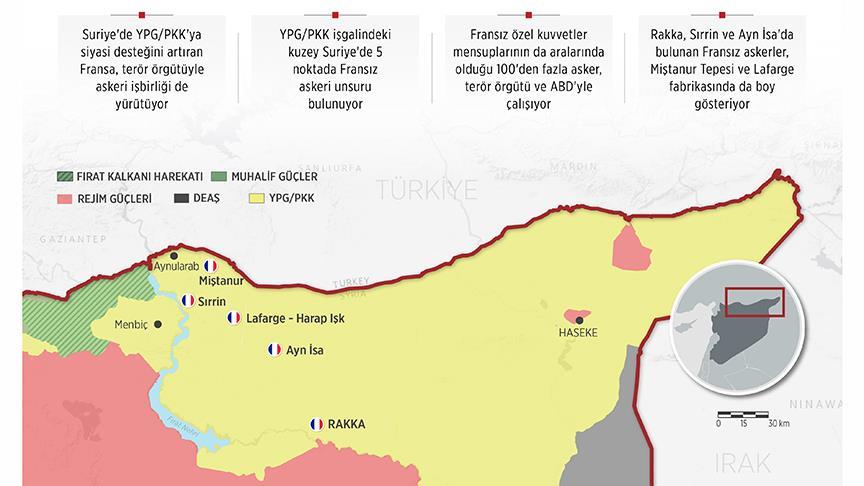 AA'ya bilgi veren güvenilir yerel kaynaklara göre, söz konusu tarihten bu yana Fransız Özel Kuvvetlerine mensup 70'den fazla asker DEAŞ karşıtı uluslararası koalisyon gücü adı altında Suriye'nin kuzeyindeki Aynularab'ın (Kobani) güneyinde bulunan Miştanur Tepesi, Sırrin ilçesi, Ayn İsa beldesi ve Harab Işk köyündeki Fransız Lafarge çimento fabrikasında üslü.