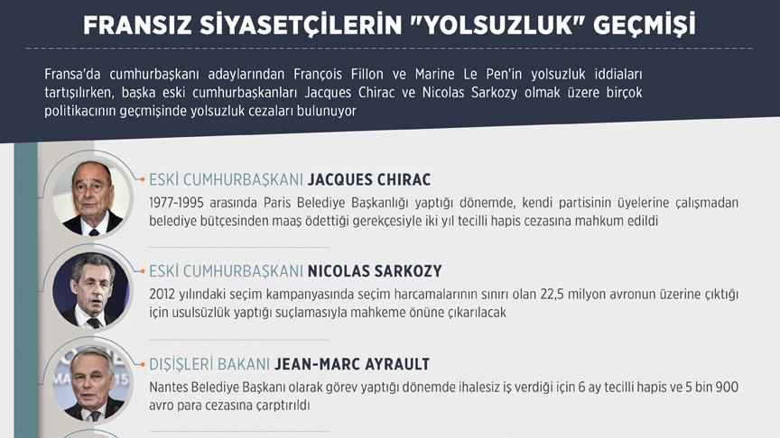 AA muhabirinin derlediği bilgilere göre, Fillon ve Le Pen'in yanı sıra başta eski cumhurbaşkanları Jacques Chirac ve Nicolas Sarkozy olmak üzere çok sayıda lider yolsuzlukla anıldı.