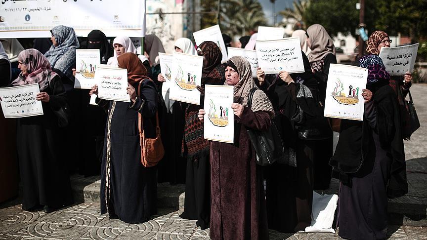 Filistin Kadın İşleri Bakanlığının, Kadına Yönelik Şiddete Karşı Uluslararası Mücadele Günü etkinlikleri kapsamında Gazze'deki Meçhul Asker Meydanı'nda düzenlediği gösteriye katılan Filistinliler, "İsrail'in ihlallerine karşı güvenlik ve korunma Kudüslü kadınların hakkıdır." yazılı pankartlar taşıdı.