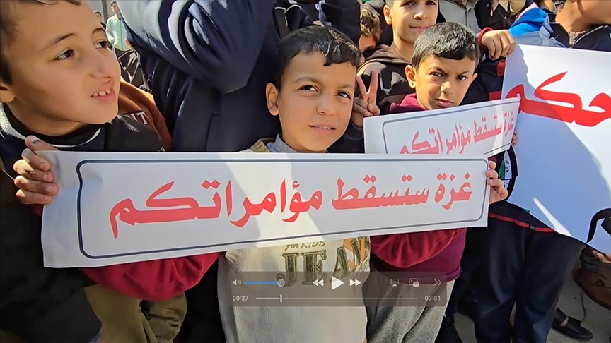 Aralarında çocukların da bulunduğu çok sayıda Filistinli, ellerinde "Filistin bizim, Gazze bizim, bu topraklar bizim, hiçbir yere gitmiyoruz, topraklarımızı terk etmeyeceğiz, Gazze planlarınızı yıkacak, bu topraklar yalnızca halkını kucaklar" yazılı pankartlar taşıdı.