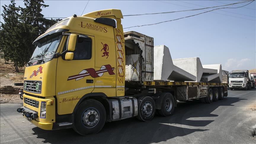 Kullanılacak beton blokları taşıyan 11 tır, Hatay'ın Reyhanlı ilçesindeki Cilvegözü Sınır Kapısı'ndan çıkış yaptı.