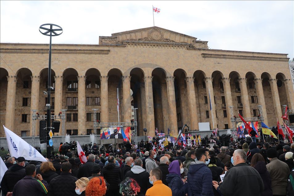 Gürcistan'da 31 Ekim'de 10. kez yapılan genel seçim sonuçlarını kabul etmeyerek seçimlerin yeniden düzenlenmesini isteyen muhalefetin protesto gösterisi düzenlendi. Açıklanan seçim sonuçlarının iptal edilmesini ve seçimlerin yenilenmesini bir kez daha talep eden çeşitli muhalefet partileri ve destekçileri başkent Tiflis'te Parlamento Binası önünde toplandı. ( Davit Kachkachishvili - Anadolu Ajansı )