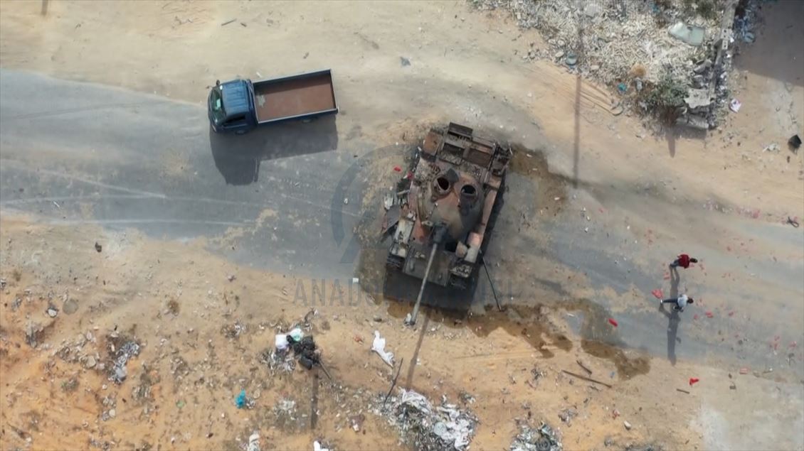 Dükkanlar ve depoların savaş nedeniyle ağır biçimde tahrip olduğu görüntülere yansırken, hurdaya dönmüş bir tank dikkati çekti.