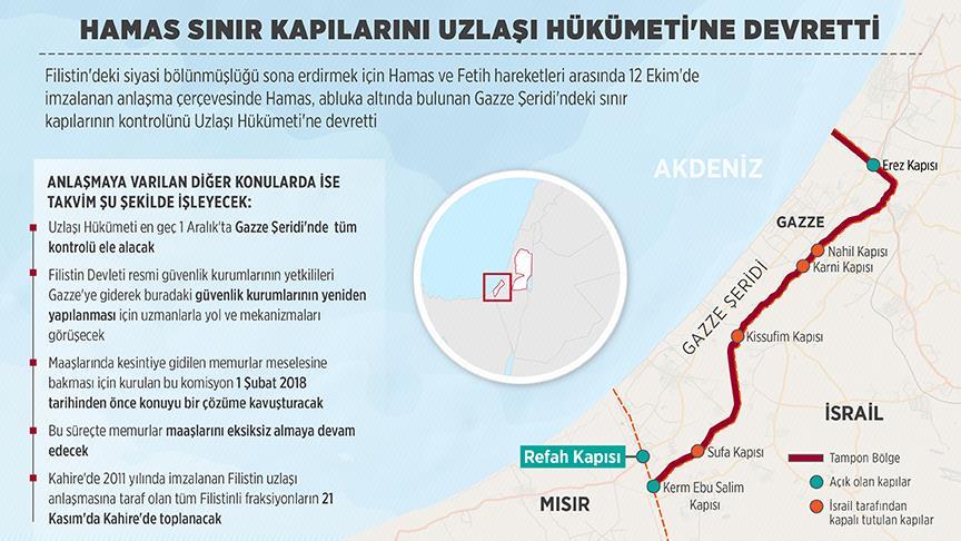 Hamas, yapılan bir törenle Gazze Şeridi'nin İsrail ve Mısır ile olan sınır kapılarındaki kontrolü tamamen Filistin Uzlaşı Hükümeti'ne devretti.