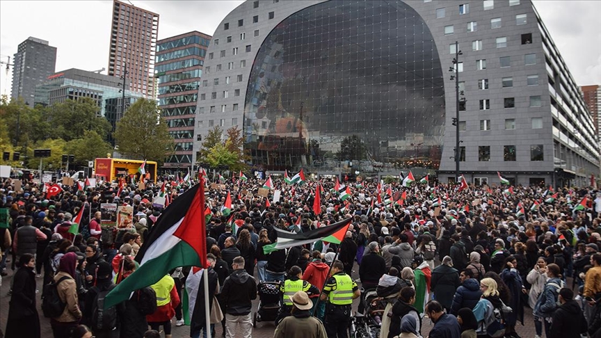 İsrail'in Gazze'deki saldırılarını protesto etmek için düzenlenen gösteriye katılan yaklaşık 10 bin kişi, Rotterdam Mahkemesine yürüdü.